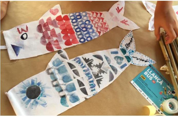 Després d'explicar la llegenda japonesa, construirem un koinibori. Utilitzarem la tècnica de l’estampació amb tinta de colors sobre roba. Un cop pintat hi afegirem un pal perquè pugui volar al vent.